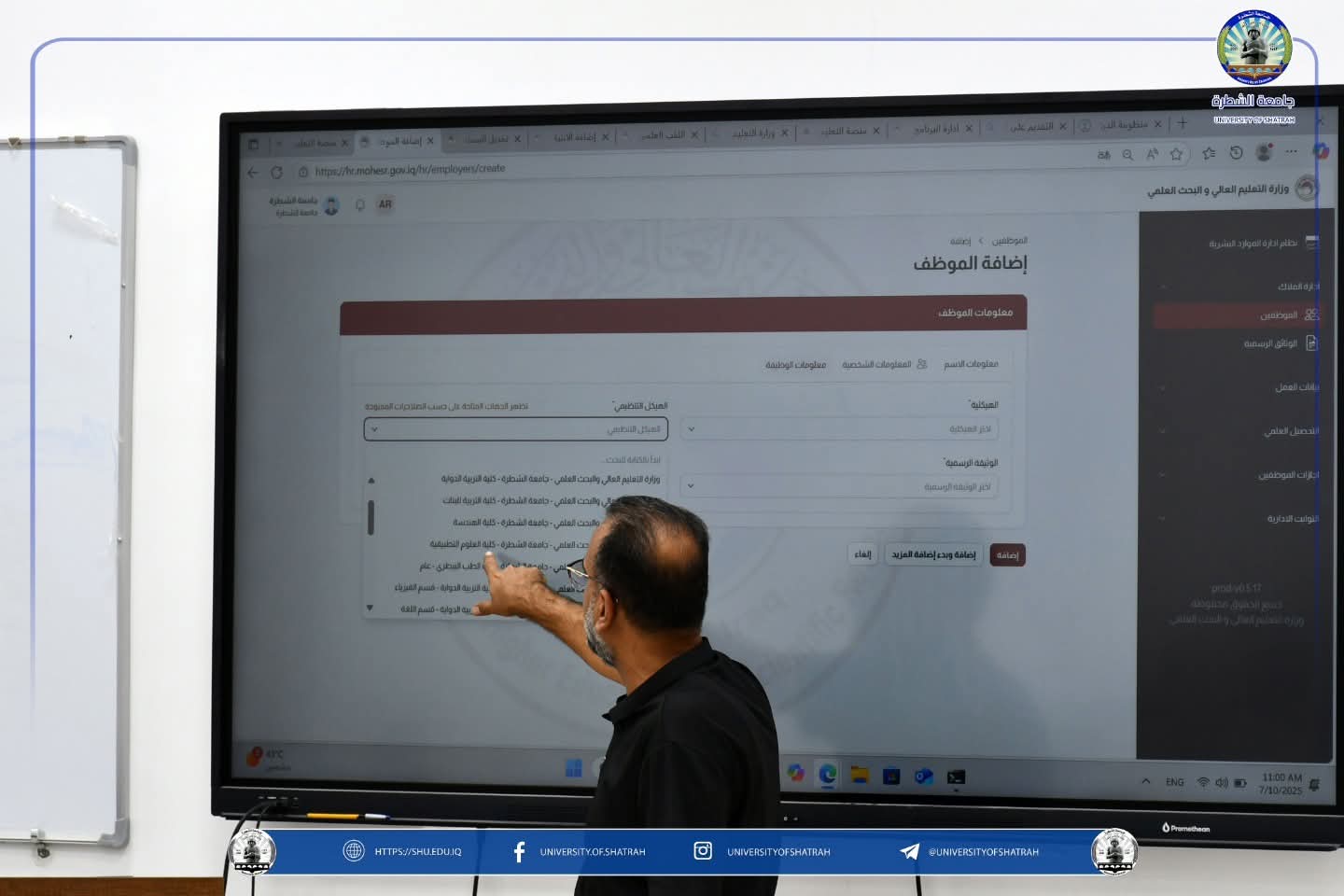 تنفيذاً لتوجيهات السيد رئيس الجامعة الأستاذ الدكتور باسم عبد الحسين جار الله، نظّمت جامعة الشطرة دورة تدريبية تخصصية بعنوان “التحول الرقمي في نظام إدارة الموارد البشرية HR ونظام إدارة معلومات الطلبة SIS ”، وذلك في إطار سعيها لتحديث البُنى الإدارية وتعزيز الكفاءة المؤسسية من خلال اعتماد الأنظمة الإلكترونية المتقدمة.