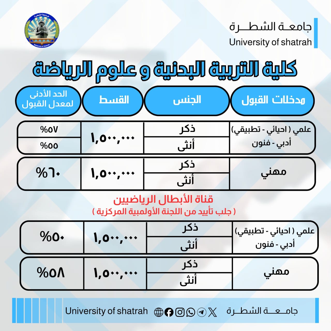 الحدود الدنيا للقبول في الدراسة المسائية مع اجور الدراسة في جامعة الشطرة كلية التربية البدنية وعلوم الرياضة