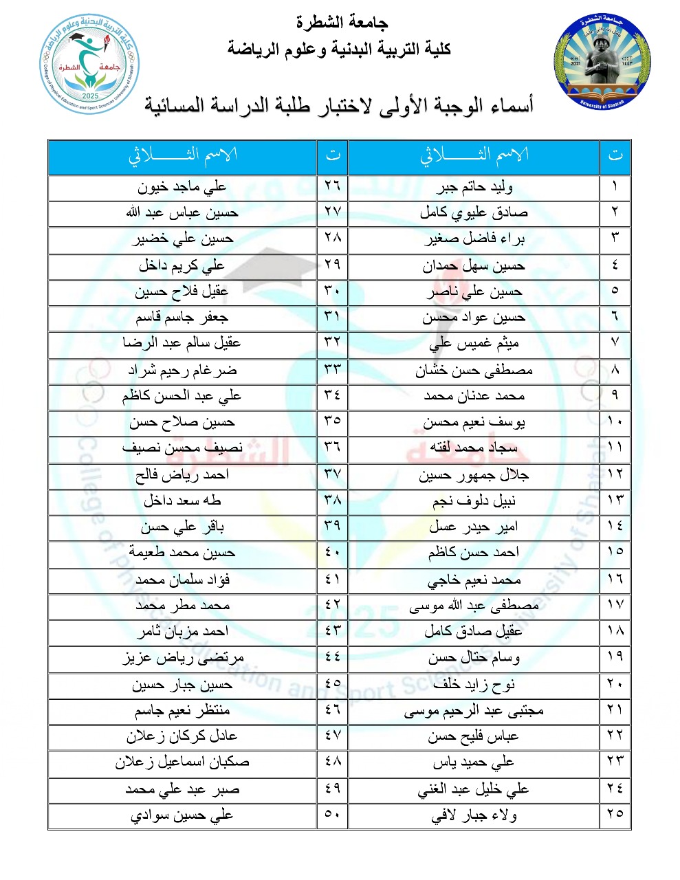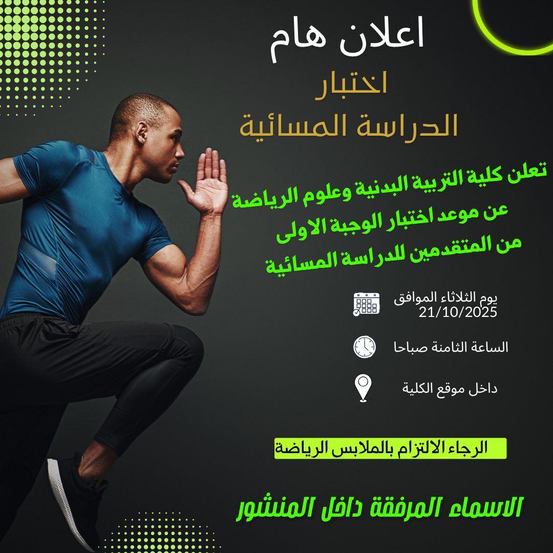 علنت كلية التربية البدنية وعلوم الرياضة عن تحديد اسماء  والموعد الرسمي لإجراء اختبارات الوجبة الأولى لطلبة الدراسة المسائية المقبولين لديها.