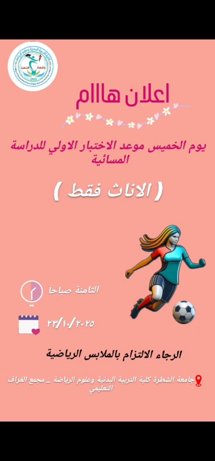 تعلن كلية التربية البدنية وعلوم الرياضة عن موعد الاختبار الأولي للدراسة المسائية (للأناث فقط) يوم الخميس الموافق ٢٣ اكتوبر الساعة الثامنة صباحآ داخل مبنى الجامعة الرجاء الالتزام بالملابس الرياضية وبالموعد المقرر.