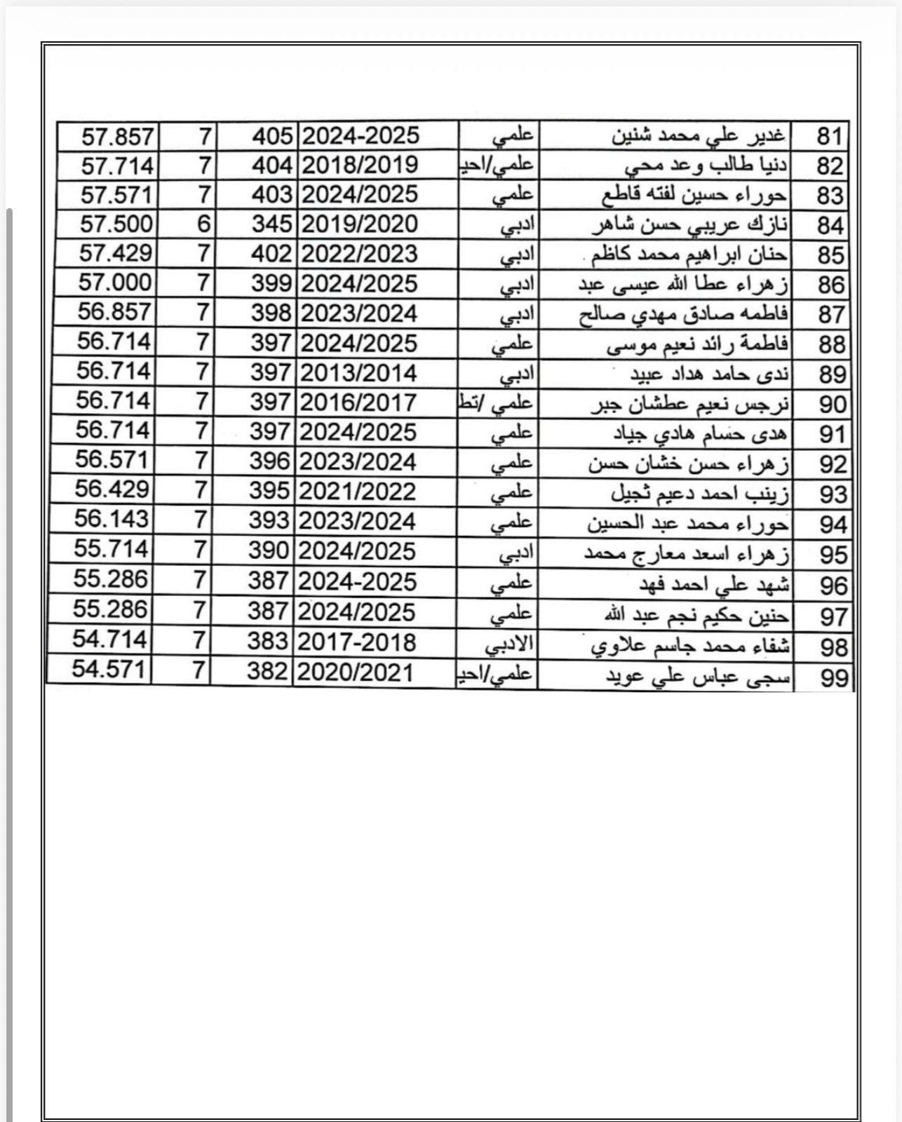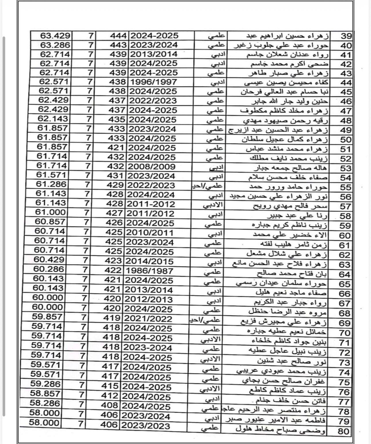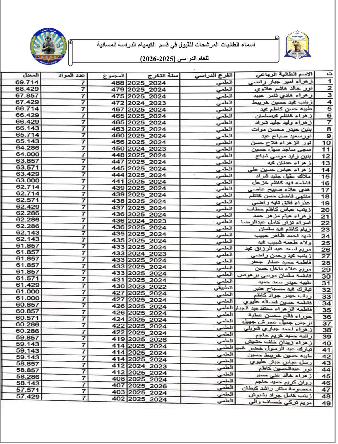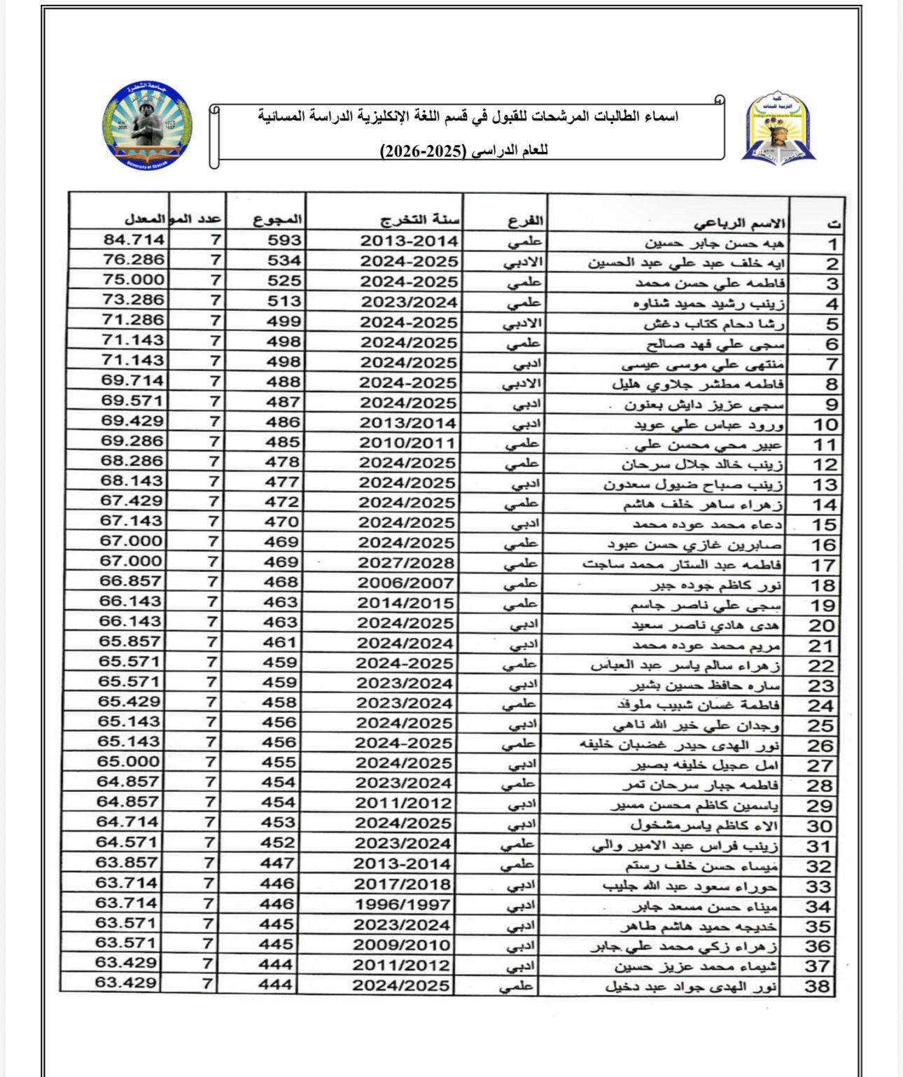 كلية التربية للبنات تعلن صدور الوجبة الأولى من أسماء المقبولات في الدراسة المسائية للعام الدراسي 2025-2026وعلى الطالبات المقبولات في هذه الوجبة مراجعة شعبة شؤون الطلبة والتسجيل في الكلية لإكمال إجراءات التسجيل خلال مدة أقصاها خمسة أيام، ابتداءً من يوم الاثنين الموافق 27 تشرين الأول 2025.