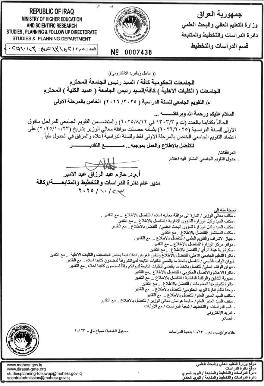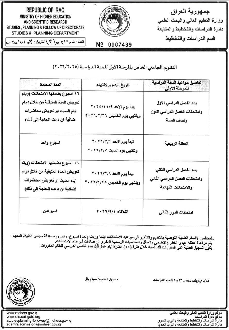 حددت وزارة التعليم العالي والبحث العلمي التاسع من تشرين الثاني 2025 موعدا لبدء الفصل الدراسي الأول لطلبة المرحلة الأولى المقبولين ضمن قنوات القبول المركزي للعام الدراسية 2026/2025.
