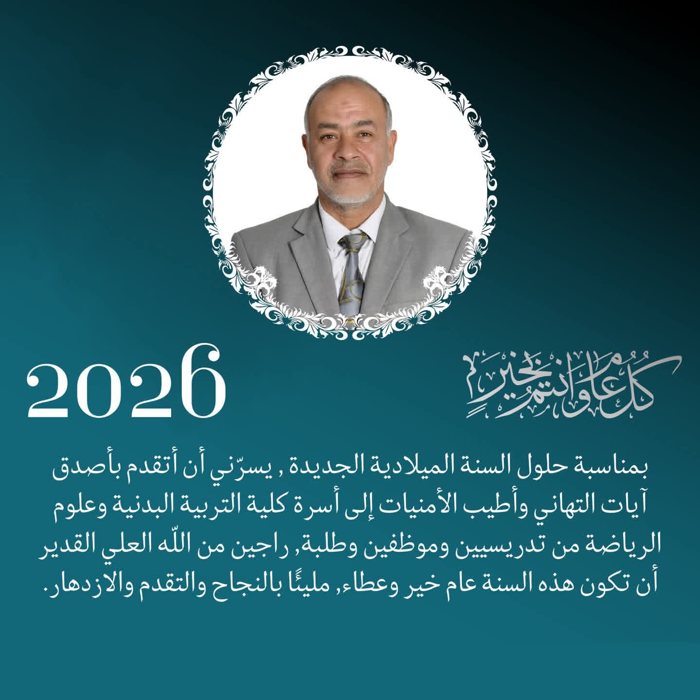 #تهنئة  السيـــــد عميد كلية التربية البدنية وعلوم الرياضة / جامعة الشطرة ( الاستاذ الدكتور عماد كاظم ياسر )  الى اسرة كلية التربية البدنية وعلوم الرياضة بمناســـبة حلول السنة الميلادية الجديدة .