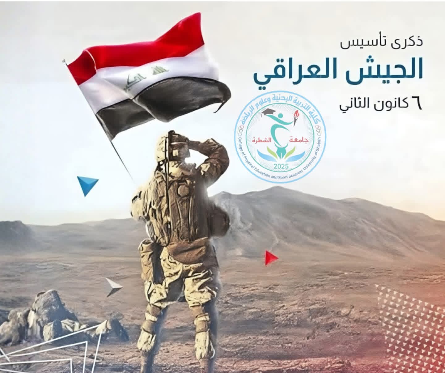 مناسبة يوم الجيش العراقي تتقدم كلية التربية البدنية وعلوم الرياضة بأسمى آيات التهاني والتبريكات إلى أبطال الجيش العراقي الباسل، صُنّاع المجد وحماة الوطن، الذين سطروا أروع ملاحم الشجاعة والتضحية دفاعًا عن أرض العراق وسيادته.