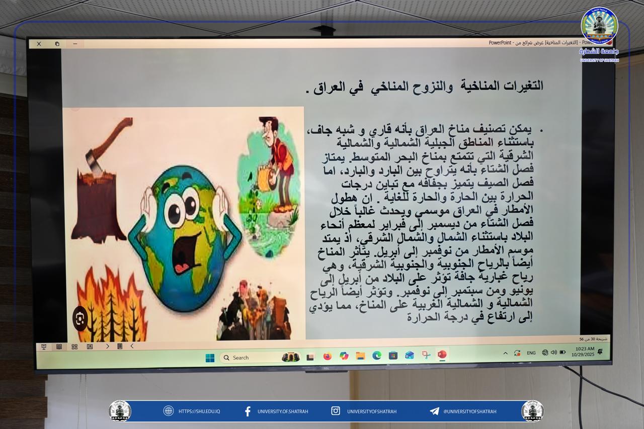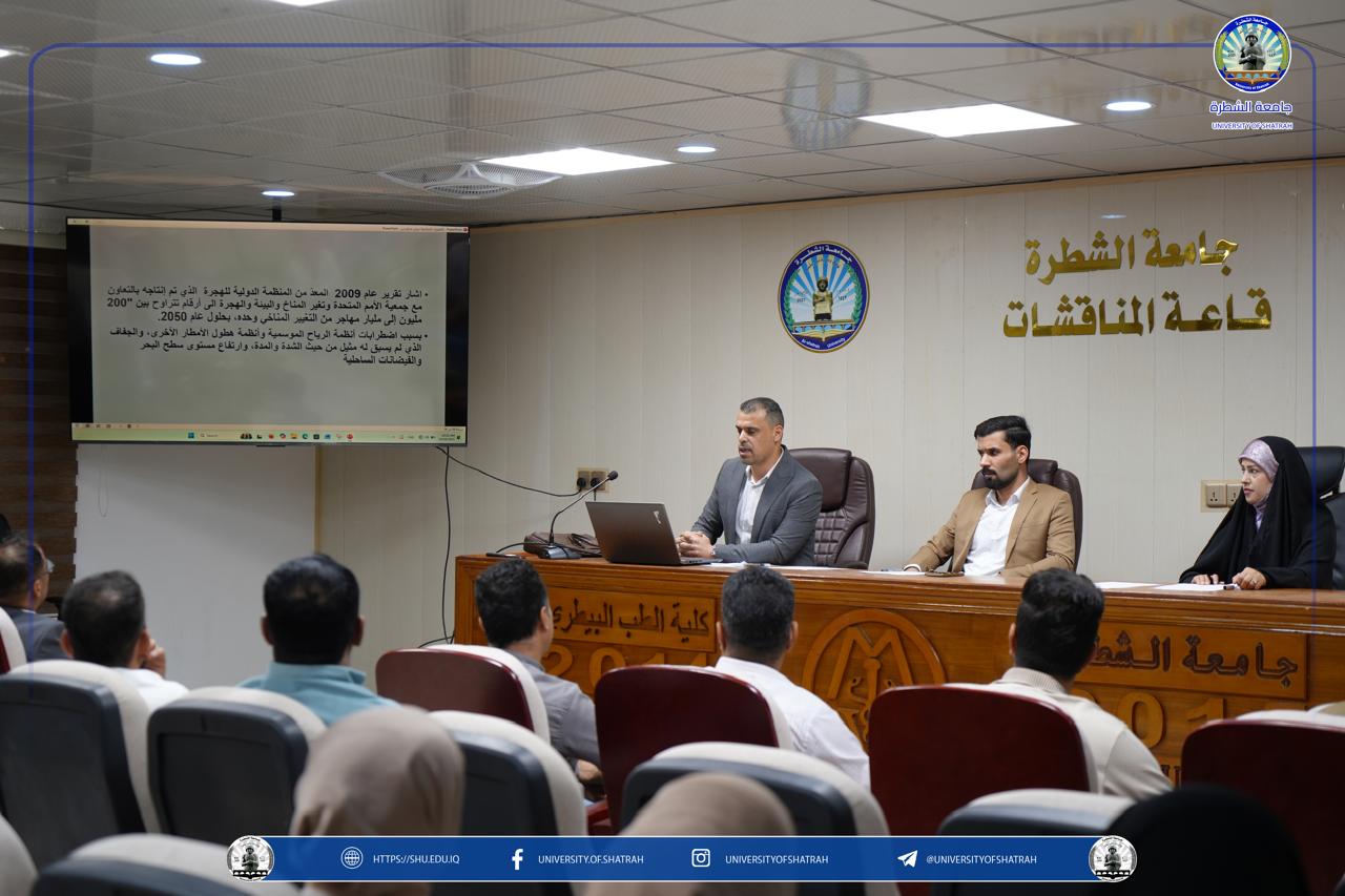 نظم قسم شؤون الدراسات العليا في رئاسة الجامعة ندوة علمية بعنوان "التغيرات المناخية في العراق وأثرها على نزوح السكان"، يوم الأربعاء 29 تشرين الاول 2025 في قاعة المناقشات في الجامعة ، حاضر في الندوة أ.م.د أحمد باقر جمعة والسيد حازم رحيم خضير، و أدارتها السيدة هبة حسين